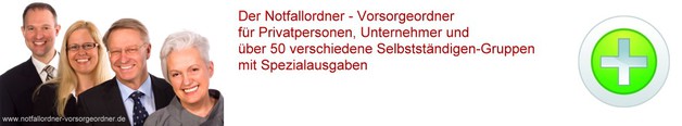Inzwischen wurde der Notfallordner auch für über 50 unterschiedliche Selbstständigen-Gruppen weiter entwickelt, so dass es vielen Menschen und Unternehmern heute möglich ist, eine umfangreiche Vorsorge zu treffen.