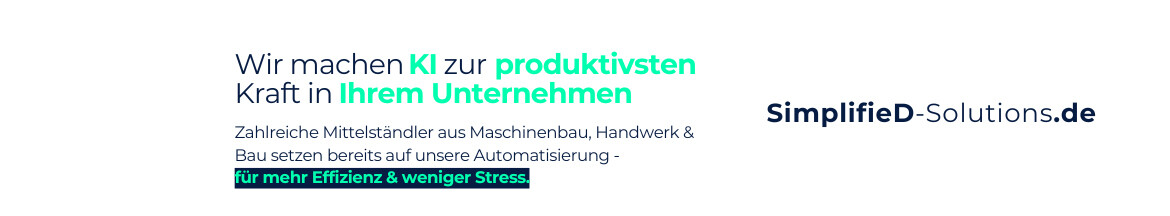 Die SimplifieD Solutions GmbH bietet Beratung und Lösungen im Bereich KI und Automatisierung, um Unternehmen kostensparender und produktiver zu machen. Wir begleiten unsere Kunden von der Analyse über interaktive Workshops bis hin zur...