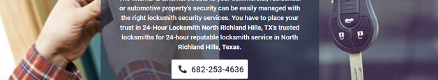 24 Hour Locksmith North Richland Hills offer comprehensive locksmith services to North Richland Hills, Texas, and its surrounding areas. No matter where your property is located, our team of licensed locksmiths is always ready to provide you with... 24-hour professional locksmith services. Increase your safety & security by decreasing theft with our service! Give our certified techs a call to get the service you need1