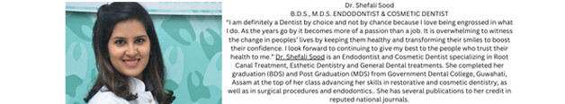 Dr. Shefali Jain Sood, Root Canal Specialist at Dental Panache, is an ardent believer in patient education and motivation, giving regular tips and tricks to her patients to maintain a healthy oral and overall health. She has pledged to change this world, ONE SMILE AT A TIME!