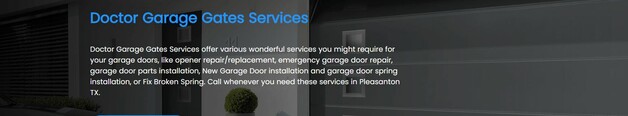 Doctor Garage Gates Services offer various wonderful services you might require for your garage doors, like opener repair/replacement, emergency garage door repair, garage door parts installation, New Garage Door installation and garage door spring installation, or Fix Broken Spring. Call whenever you need these services in Pleasanton TX.