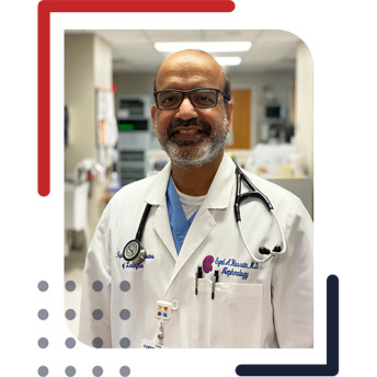 **Dr. Syed Hussain, MD** is a board-certified nephrologist serving the Houston area. He specializes in the diagnosis and treatment of kidney diseases, dialysis management, hypertension, and transplant nephrology. Dr. Hussain is dedicated to... delivering compassionate, personalized care and helping patients maintain optimal kidney health through advanced and comprehensive treatment options.