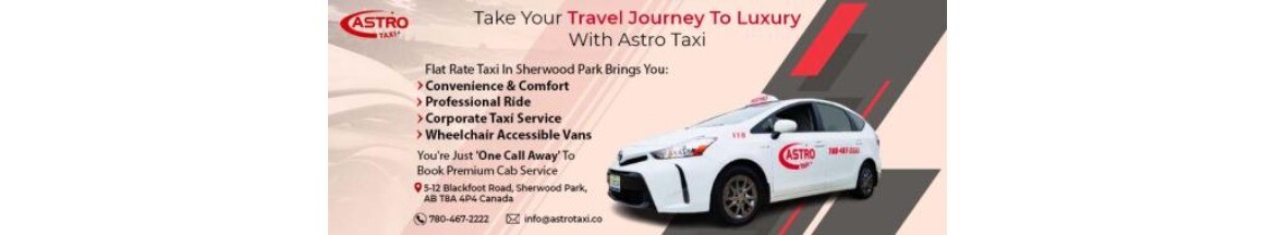 Sherwood Park Taxi Services by Astro Taxi, your dependable taxi service in Sherwood Park, offers flat rates with its luxury taxi line of Limo and Lincoln Town cars along with economical rides. Astro with its biggest fleet of 20 vehicles and 18... years of experience serves Sherwood park area twenty four hours a day and seven days a week. With its humble start in 2001, Astro Taxi soon started setting the taxi service standards in Sherwood Park, Alberta. It prides on most comfortable rides for any occasion. With its strong fleet of twenty comfortable cabs including Limo and Lincoln Town cars, you can depend on Astro taxi for speedy service during the busy seasons, including Wedding, Birthday, Christmas, Graduation, Prom, or Charity events etc.