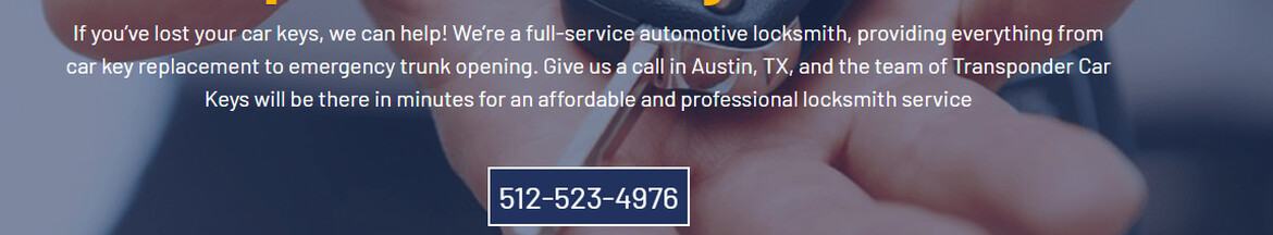On the off chance that you've lost your car keys, we can help! We're a full-service automotive locksmith, giving everything from car key replacement to crisis trunk opening. Call us in... Austin, TX, and the group of Transponder Car Keys will be there in minutes for a reasonable and professional locksmith service Replace Your Lost Transponder K
