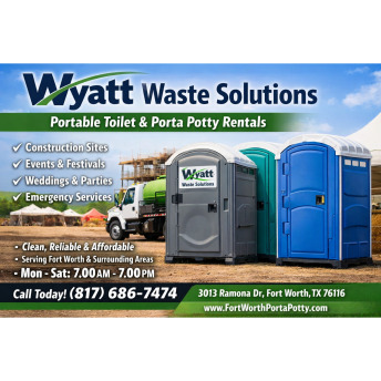 Wyatt Waste Solutions is a trusted provider of portable sanitation services based in Fort Worth, Texas, offering reliable and affordable porta potty rentals for a wide range of needs. Conveniently located at 3013 Ramona Dr, the company serves... residential, commercial, and event clients throughout the surrounding areas with a strong commitment to cleanliness, punctuality, and customer satisfaction.