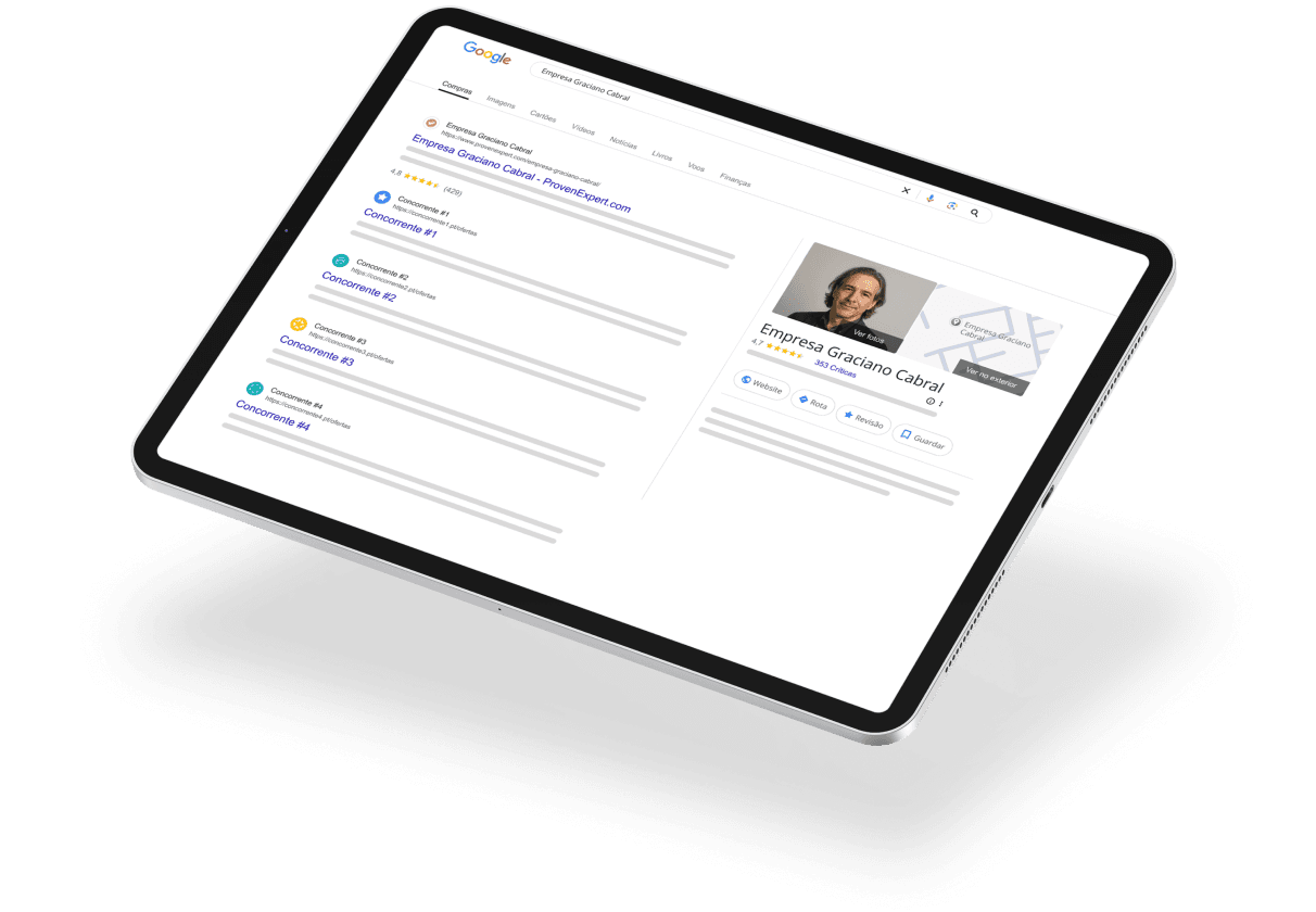 O seu perfil ProvenExpert é automaticamente optimizado para motores de busca como o Google para garantir que os potenciais clientes o encontrem facilmente em vez da concorrência. Obtenha maior visibilidade, mais cliques e mais clientes novos com as classificações de estrelas do Google listadas no seu perfil ProvenExpert, nas suas listagens do Google e no seu próprio website.